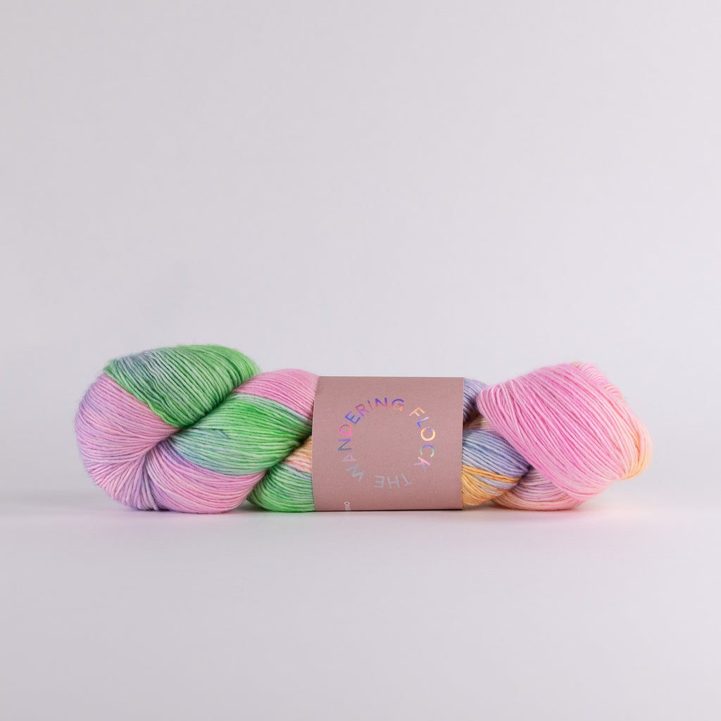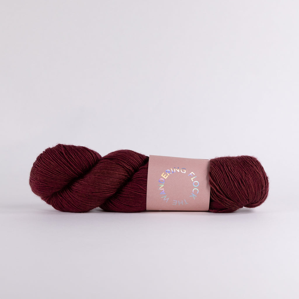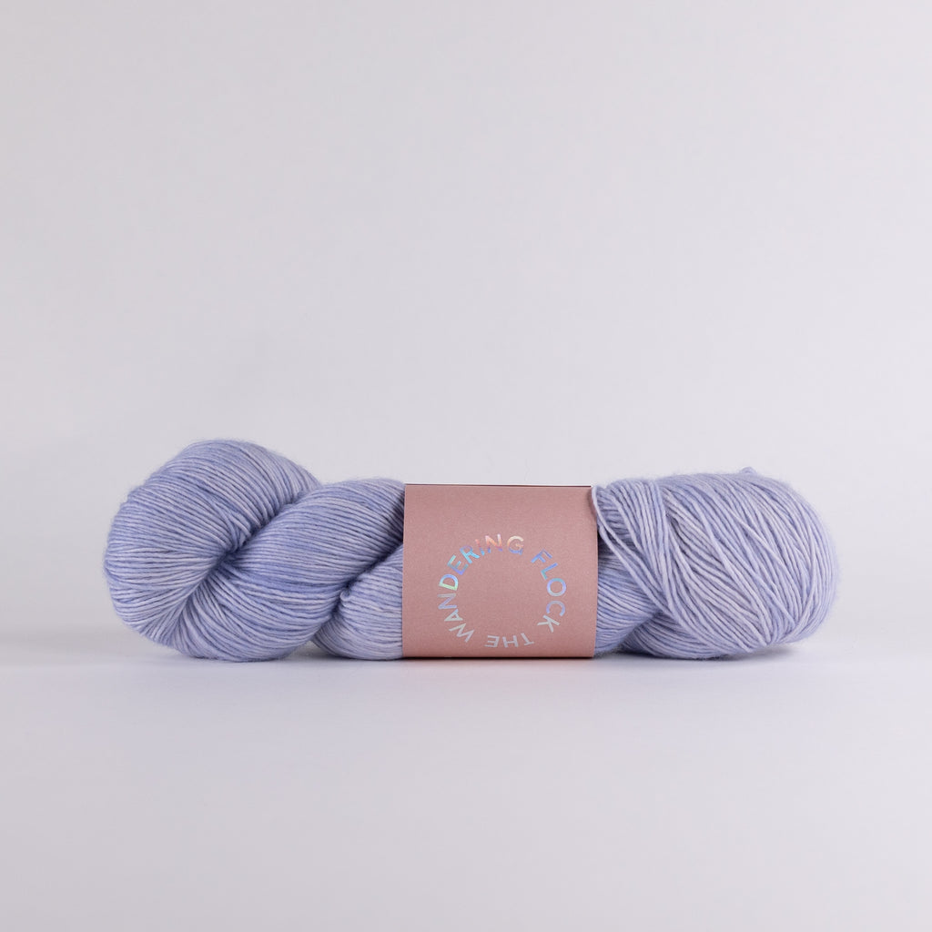 Fingering Singles from Wandering Flock is a smooth single ply with a wonderful sheen that adds dimension and richness to each colorway. After blocking, its full softness blooms.